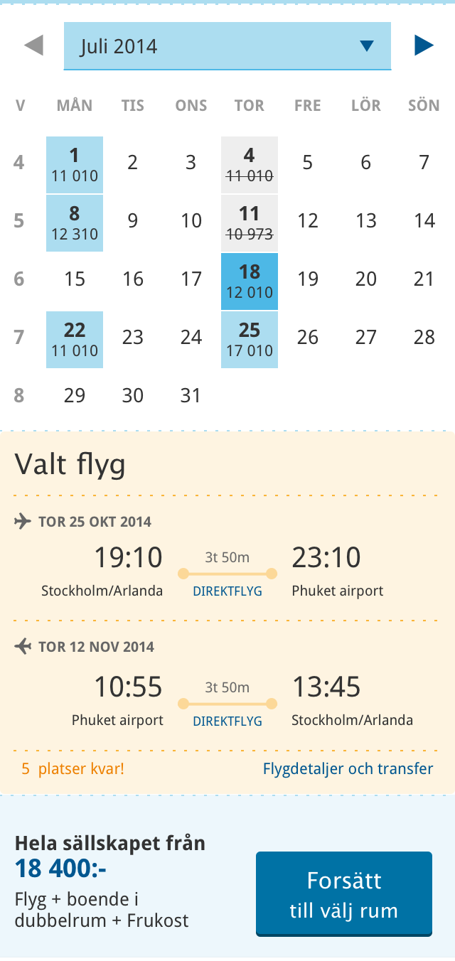 Date picker showing prices and sold out dates, then chosen flight and price with specifications.