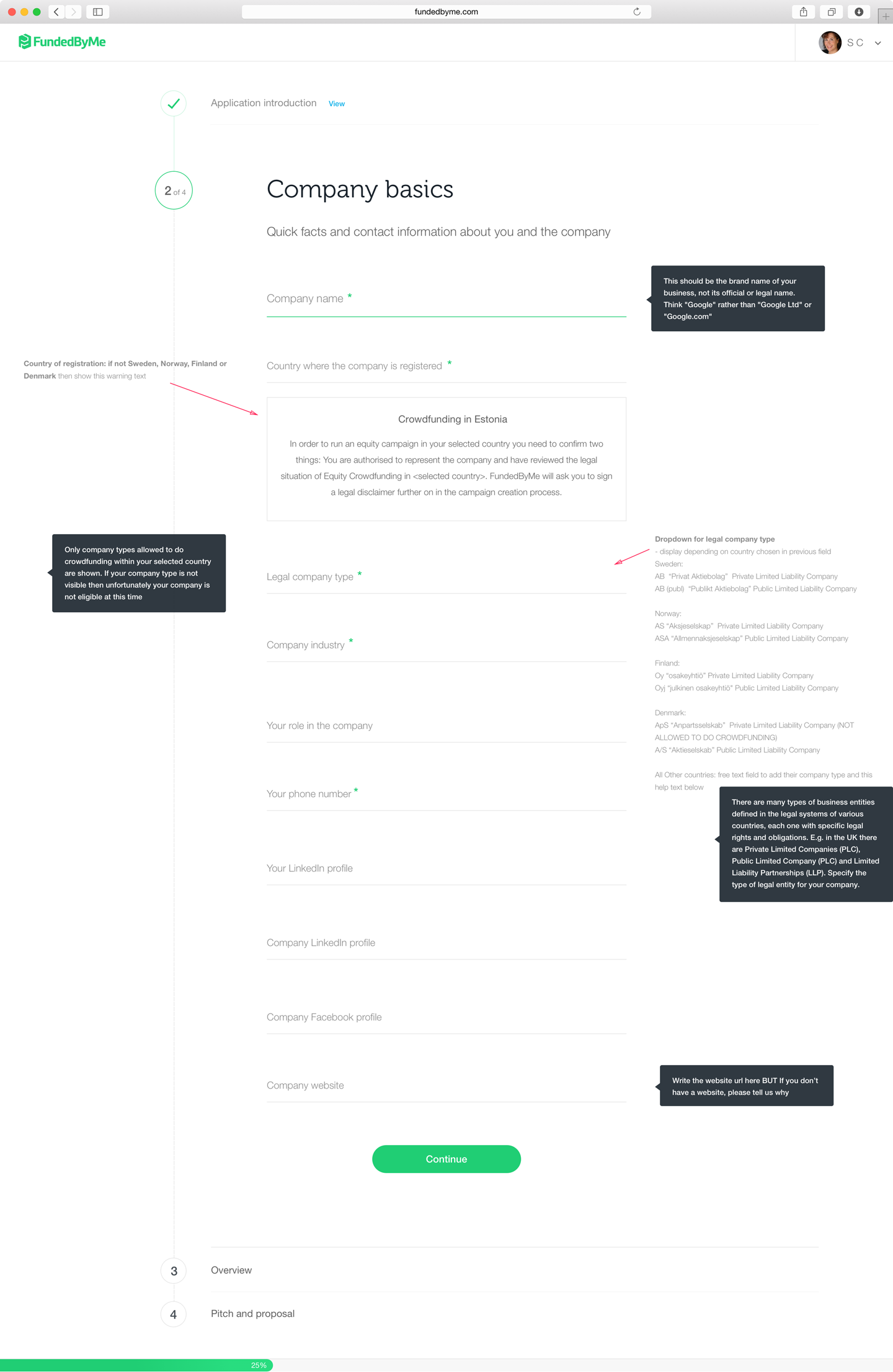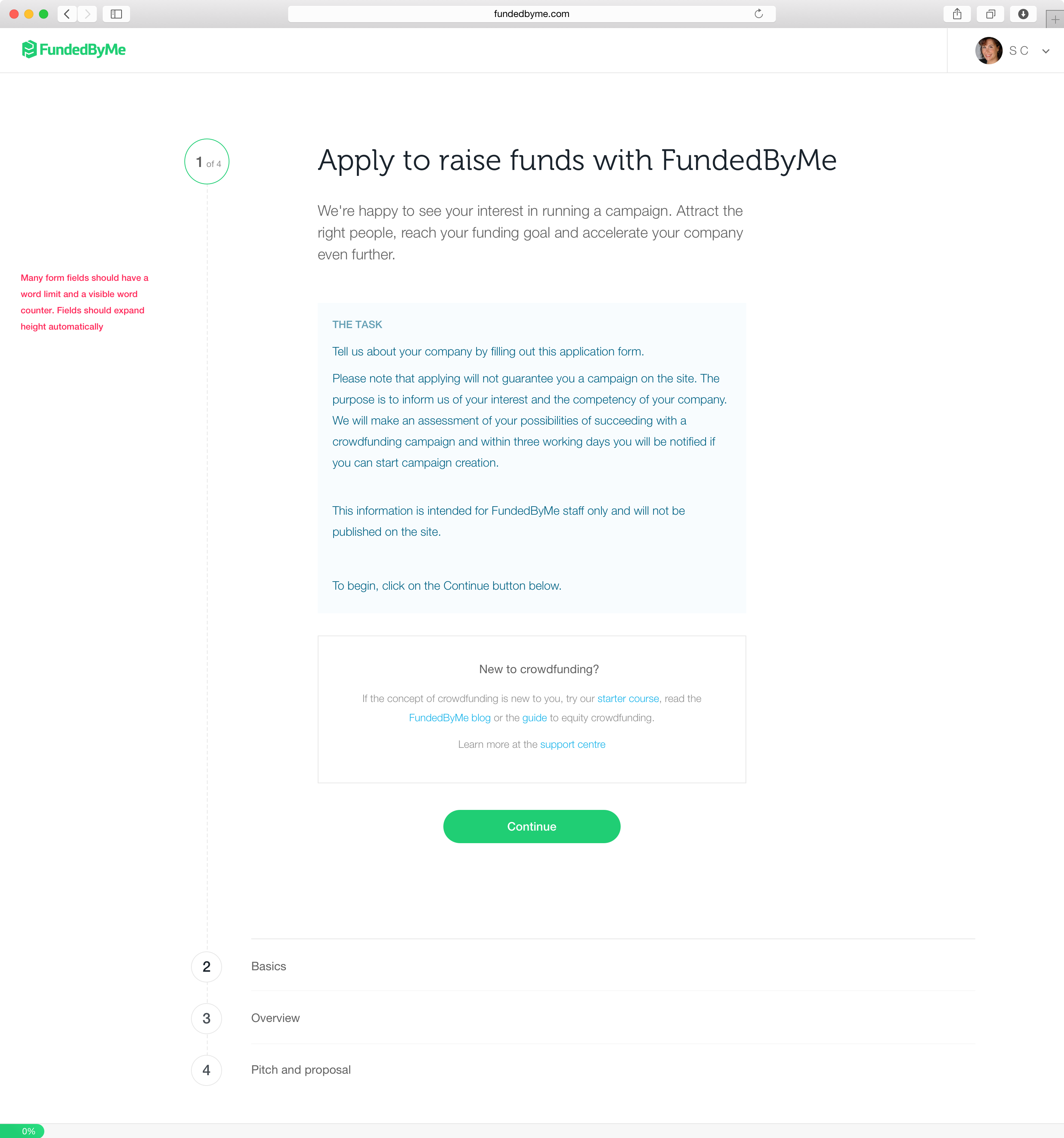 Through user interviews with entrepreneurs and the sales team, I identified an issue of both groups wasting their time. So in order to properly evaluate companies before they created a complete campaign, I created an application form for them to fill out. This form enables the sales team to spend less time evaluating companies and the companies themselves have not wasted a lot of their time only to be declined the right to campaign on FundedByMe. See the form here